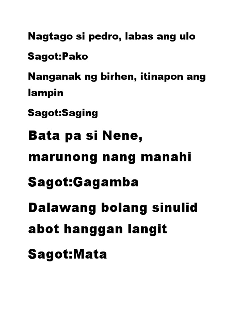 May puno walang bunga sagot. Maasim talaga ang kanyang bunga may sampal na kasama mula sa ada. Sandok Kung tawagin nilay santo hindi naman milagroso. Bahay ni ka huli haligiy balibali ang bubong ay kawali.