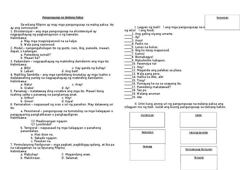 The first part of this 15-item worksheet asks the student to identify whether the sentence is a pangungusap na pautos or a pangungusap na pakiusap. Pangungusap na walang paksa 1. Ang Mababang Paaralan ng Sto.